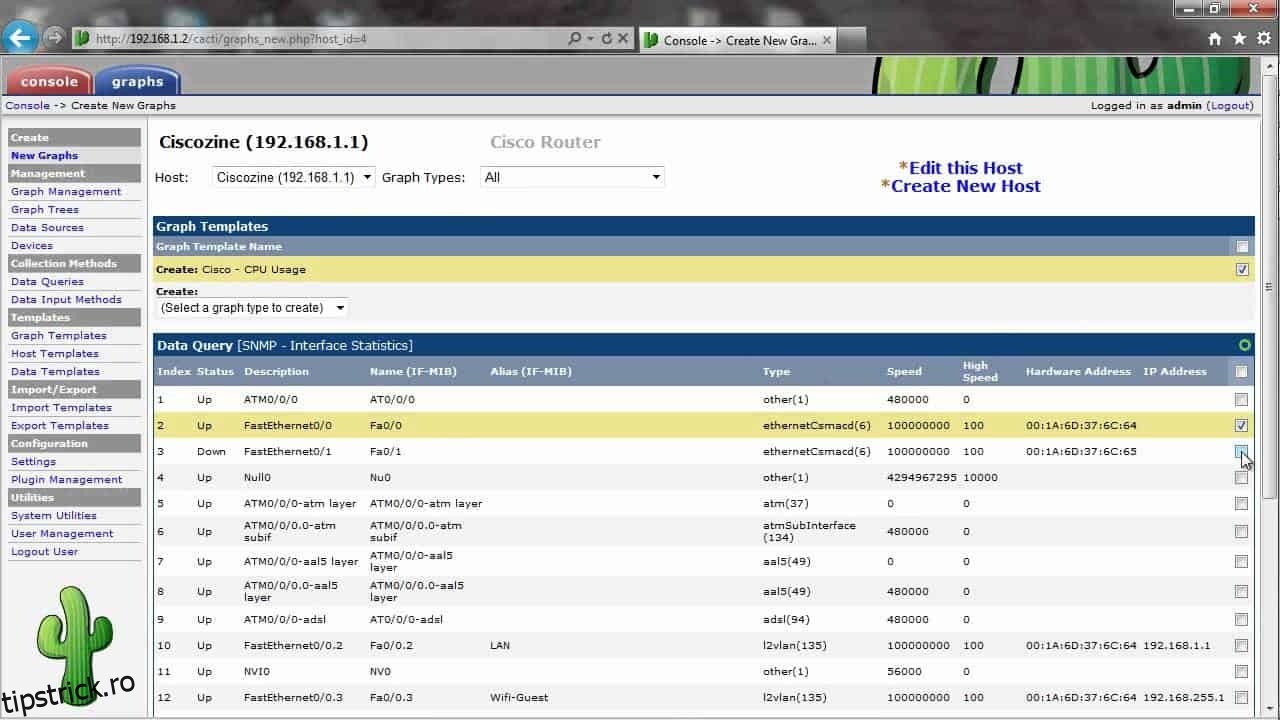 Configurarea Cacti este simplă. Adăugarea unui dispozitiv, de exemplu, necesită introducerea adresei IP sau a numelui de gazdă și a comunității SNMP. Software-ul va descoperi interfețele dispozitivului și va permite selecția celor pentru care se vor crea grafice de utilizare.