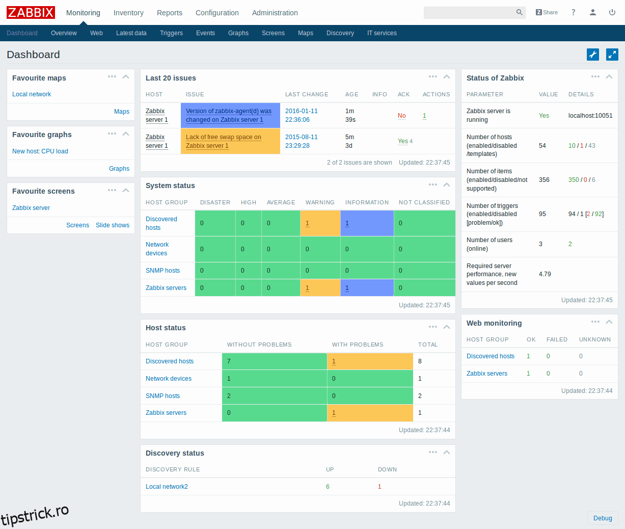 Zabbix este o soluție gratuită și open-source versatilă, utilizată pentru a monitoriza diverse componente ale infrastructurii IT, inclusiv rețele, servere, aplicații și servicii, precum și medii bazate pe cloud. Se remarcă printr-o interfață profesională, tipică unui produs comercial, dar calitatea sa nu se limitează doar la aspect. Zabbix oferă o gamă largă de funcționalități, scalabilitate nelimitată, monitorizare distribuită, securitate robustă și disponibilitate ridicată, fiind o adevărată soluție la nivel de întreprindere.
