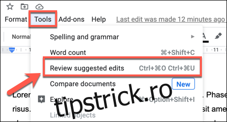 În cazul în care doriți să respingeți (și să eliminați) toate editările sugerate dintr-un document Google Docs simultan, aveți posibilitatea de a face acest lucru dând clic pe Instrumente > Examinați modificările sugerate.