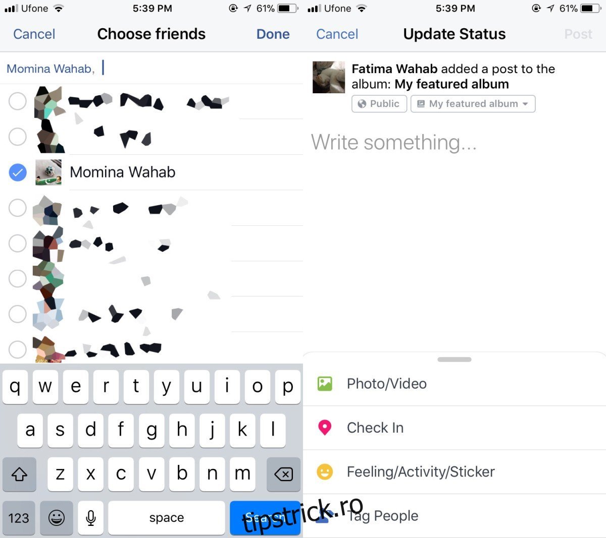 Alegeți apoi prietenii pe care doriți să-i invitați să contribuie și selectați „Terminat”. Veți fi redirecționat la o pagină de actualizare a statusului, care s-ar putea să nu pară locul potrivit pentru crearea unui album, dar este corect. Apăsați opțiunea „Fotografii/Video” și selectați imaginile pe care doriți să le adăugați.