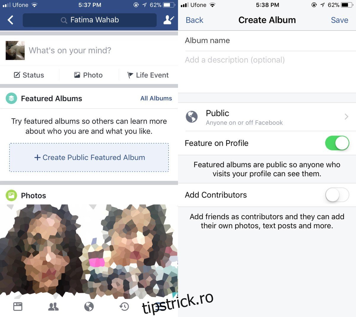 Deschideți aplicația Facebook și intrați pe profilul personal. Derulați până ajungeți la secțiunea cu fotografiile. Chiar deasupra acesteia, veți găsi butonul „Creează un album public recomandat”. Apăsați-l. Introduceți un nume pentru album, adăugați colaboratorii doriți și atingeți „Salvați”.