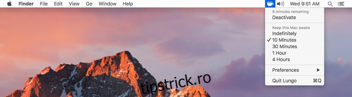 Instalați Lungo din Mac App Store și porniți aplicația. Aceasta funcționează direct din bara de meniu. După ce faceți clic pe pictograma aplicației, puteți alege intervalul de timp pentru care doriți să mențineți Mac-ul activ. Aveți opțiunea de a-l menține activ nelimitat sau pentru intervale predefinite, precum 10 sau 30 de minute, sau 1 sau 4 ore.