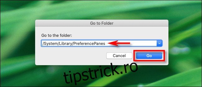 În fereastra sau câmpul text „Go To Folder” care apare, scrie sau lipește următorul text: /System/Library/PreferencePanes.