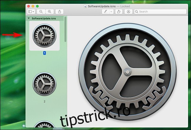 În Previzualizare, vei observa că fișierul .icns conține pictograme de diferite dimensiuni. Cea mai mare pictogramă se va afla în partea de sus a listei din panoul din stânga. Fă click pe ea pentru a o selecta.