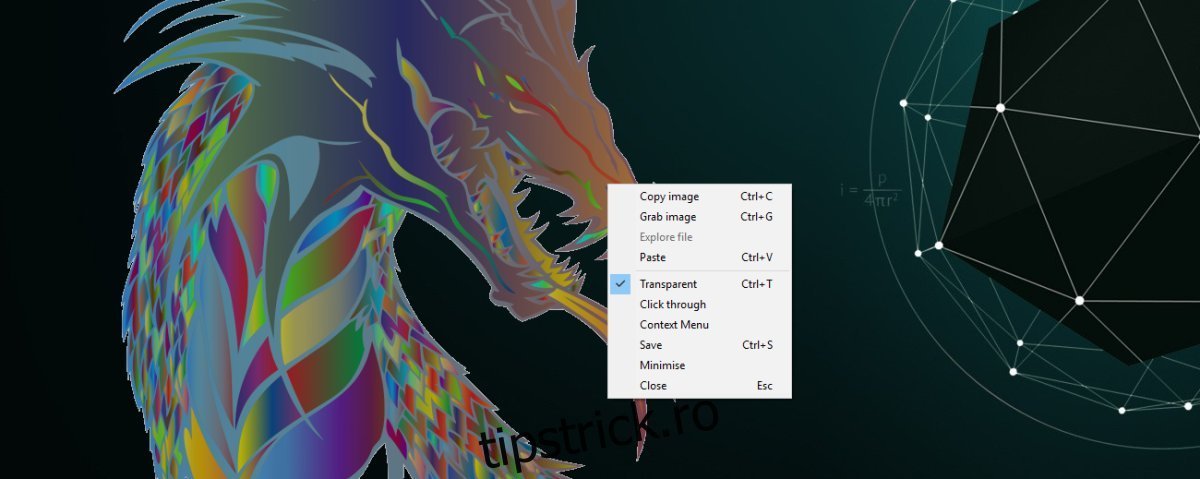 Imaginea este transparentă în mod implicit, dar opțiunea „Click through” nu este activată. După ce activați această opțiune, nu veți mai putea accesa meniul contextual al aplicației. Pentru a face acest lucru, trebuie să închideți aplicația și să o redeschideți. ScreenDragons suportă mai multe instanțe. Puteți utiliza această facilitate pentru a deschide și fixa mai multe imagini în partea de sus a ecranului.