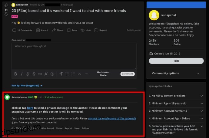 Ideea generală este simplă: creezi o postare care descrie vârsta, audiența țintă și intențiile tale, iar botul subreddit-ului facilitează schimbul de mesaje directe. Subreddit-ul Snapchat nu permite conținutul nepotrivit pentru muncă (NSFW), dar poți găsi alte comunități care permit acest tip de conținut.