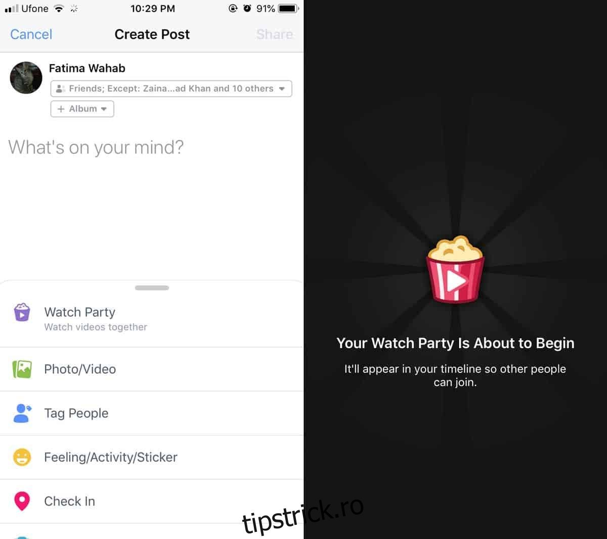 Deschide aplicația Facebook și atinge butonul pentru o nouă postare. Aici vei găsi și opțiunea Petrecere de Vizionare. Apasă pe ea și alege un nume pentru evenimentul tău. Vei avea la dispoziție aceleași opțiuni de selectare a videoclipurilor ca și pe varianta web, dar poți ignora această parte pentru moment. Publică petrecerea pe cronologia ta.