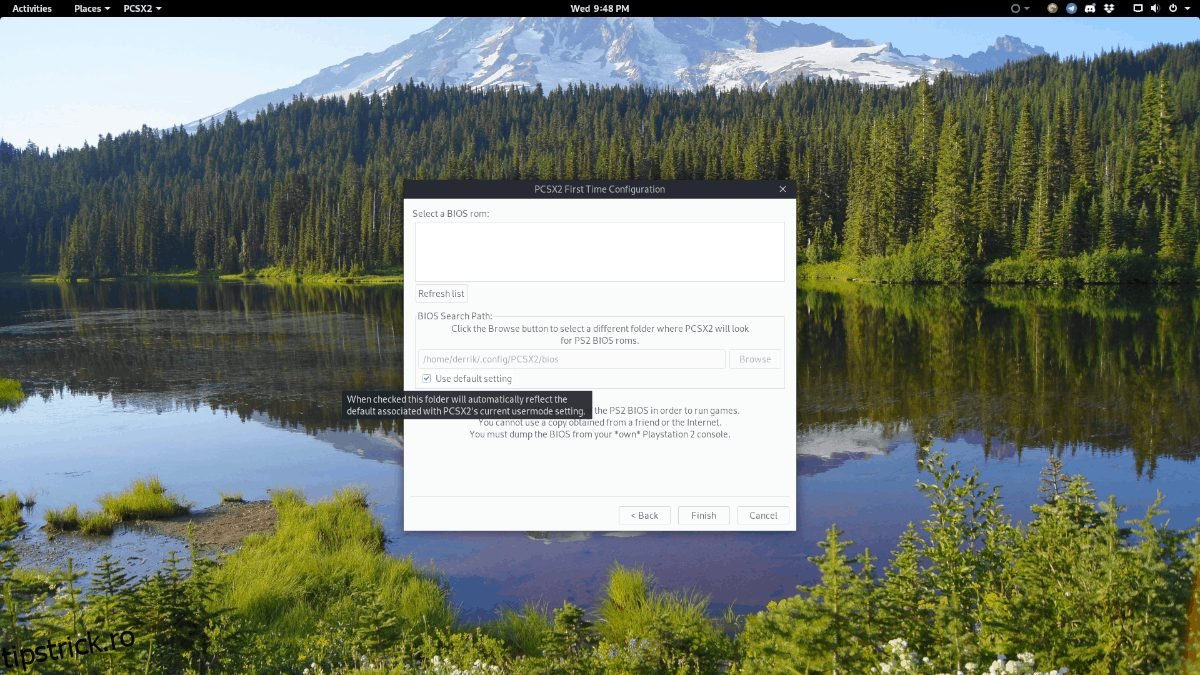 După pagina cu plugin-uri, vei observa un mesaj care îți indică faptul că trebuie să adaugi fișierele BIOS PlayStation 2 în emulator înainte de a putea juca. Obține fișierele BIOS pentru PS2 în mod legal (prin copierea acestora pe calculatorul tău Linux). Apoi, apasă butonul „Răsfoire” și adaugă fișierele BIOS în emulator.