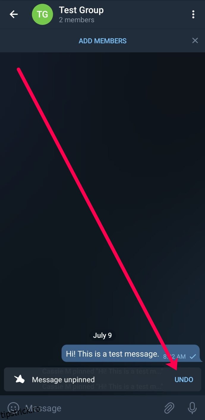 Din păcate, Telegram nu oferă o metodă directă de recuperare a unui mesaj fixat. În primul rând, trebuie să fii administrator. Apoi, trebuie să acționezi rapid, în câteva secunde, pentru a fixa mesajul din nou.