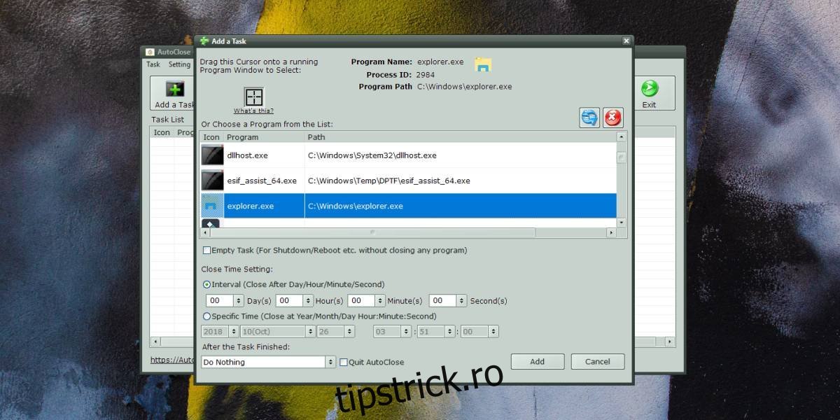 În interiorul aplicației, dați clic pe butonul „Adăugați o activitate” și selectați aplicația sau procesul pe care doriți să îl închideți automat.