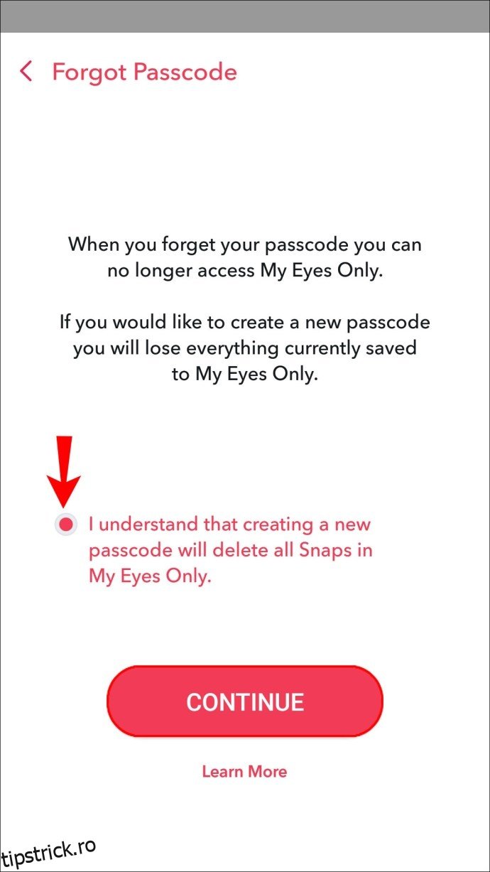 Dacă ați uitat parola pentru „Doar pentru ochii mei”, o puteți reseta. Totuși, veți pierde definitiv toate instantaneele salvate în prezent în această secțiune.