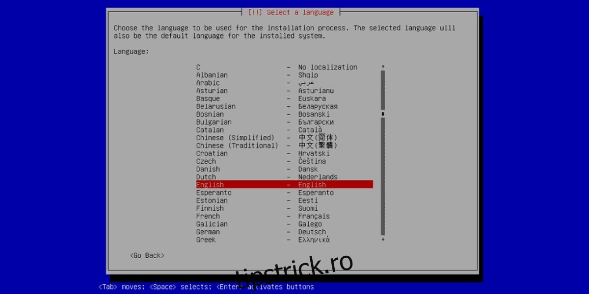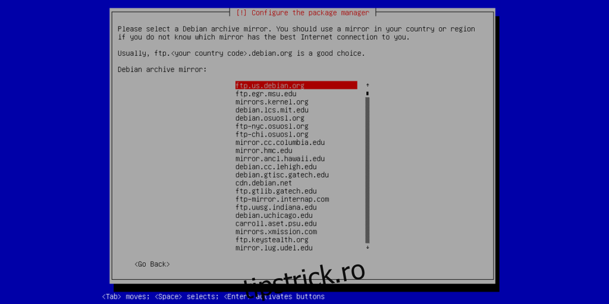 În pasul următor, va trebui să selectezi un mirror de unde se vor descărca pachetele software. Un mirror este un server care conține o copie a tuturor fișierelor necesare unei distribuții Linux. Dacă serverul principal este suprasolicitat, alege un mirror cât mai apropiat geografic de tine pentru o descărcare mai rapidă.