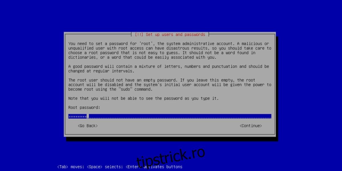 După ce ai configurat sursa software-ului, urmează setarea utilizatorului, a numelui de gazdă și a parolei pentru OpenMediaVault (OMV). Începe prin a introduce o parolă de root sigură, deoarece aceasta este principala barieră de securitate a NAS-ului tău. Alege o parolă memorabilă, dar dificil de ghicit. Dacă nu ești sigur cum să creezi una puternică, un generator de parole securizat, cum ar fi Generator de parole puternice, te poate ajuta.